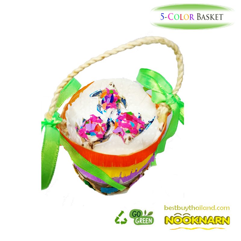 ตะกร้าเข็มกลัดดักแด้ 5 สี มีเหรียญสิริมงคล (โบว์แดง)